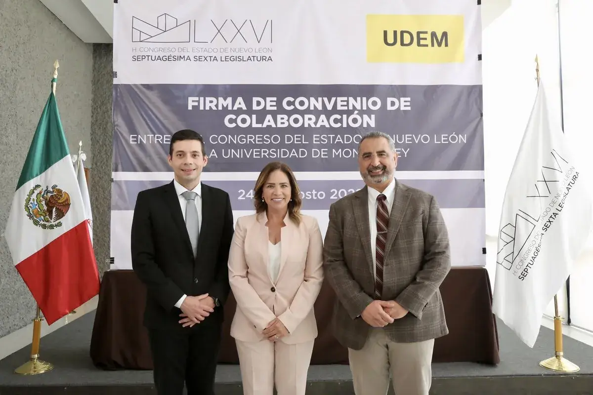 El convenio fue firmado por Ivonne Álvarez García, presidenta del Congreso local; Arturo Azuara Flores, decano de la Escuela de Derecho y Ciencias Sociales de la UDEM; y Raúl Morales, director de Licenciatura en Derecho, la Licenciatura en Derecho y Finanzas, y la Licenciatura en Derecho y Función Pública de la UDEM.
