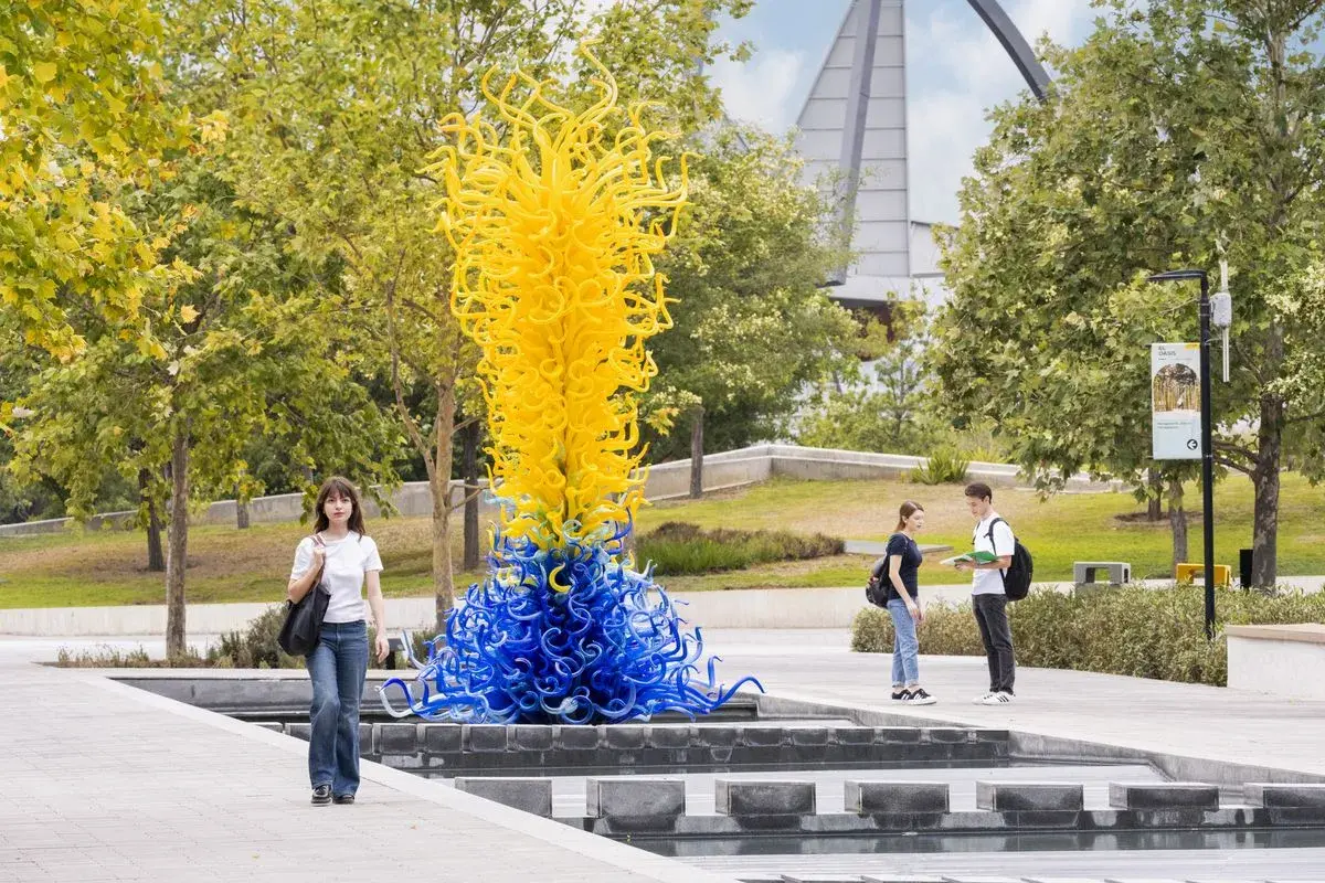 - Creada exclusivamente para la Universidad de Monterrey, se alza sobre la fuente escalonada de El Solar la pieza de gran formato “Sunrise Yellow and Azure Tower” (2024), de Dale Chihuly, artista contemporáneo reconocido mundialmente como el maestro de la escultura de vidrio soplado