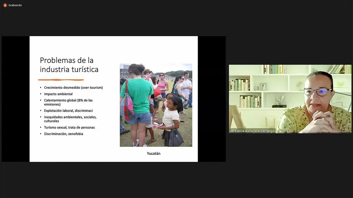 La profesora inició su charla recordando que la pandemia del COVID-19 dejó al descubierto muchos problemas socioeconómicos como el crecimiento desmedido, el impacto ambiental, el calentamiento global, la explotación laboral, discriminación, etc. en la industria del turismo.