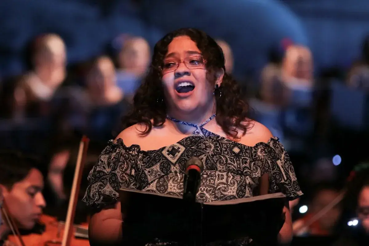 La espiritualidad de los cantos sagrados mezclados con ritmos de marchas belicistas, ejecutados por alrededor de 200 menores en escena, hizo vibrar la sala del Teatro UDEM con la presentación de la Orquesta y Coro Esperanza Azteca, acompañados por el Coro de la Arquidiócesis de Monterrey.