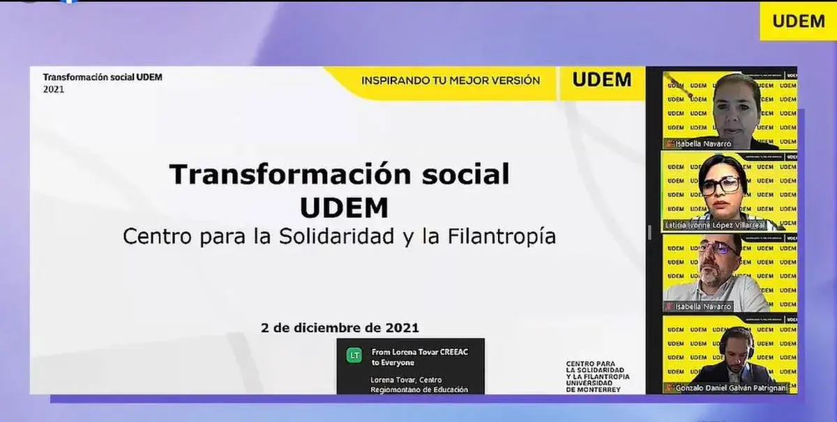 Agregó que el objetivo de la reunión de este jueves fue conocer acciones concretas realizadas durante 2021 por la comunidad UDEM, que dan a sus miembros la oportunidad de ser parte de la solución a los problemas sociales actuales.